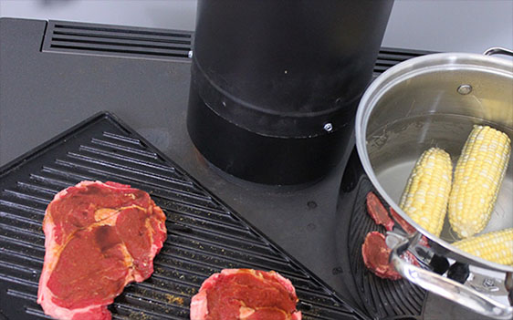 - Steaks and Corn cooking on the stovetop.
